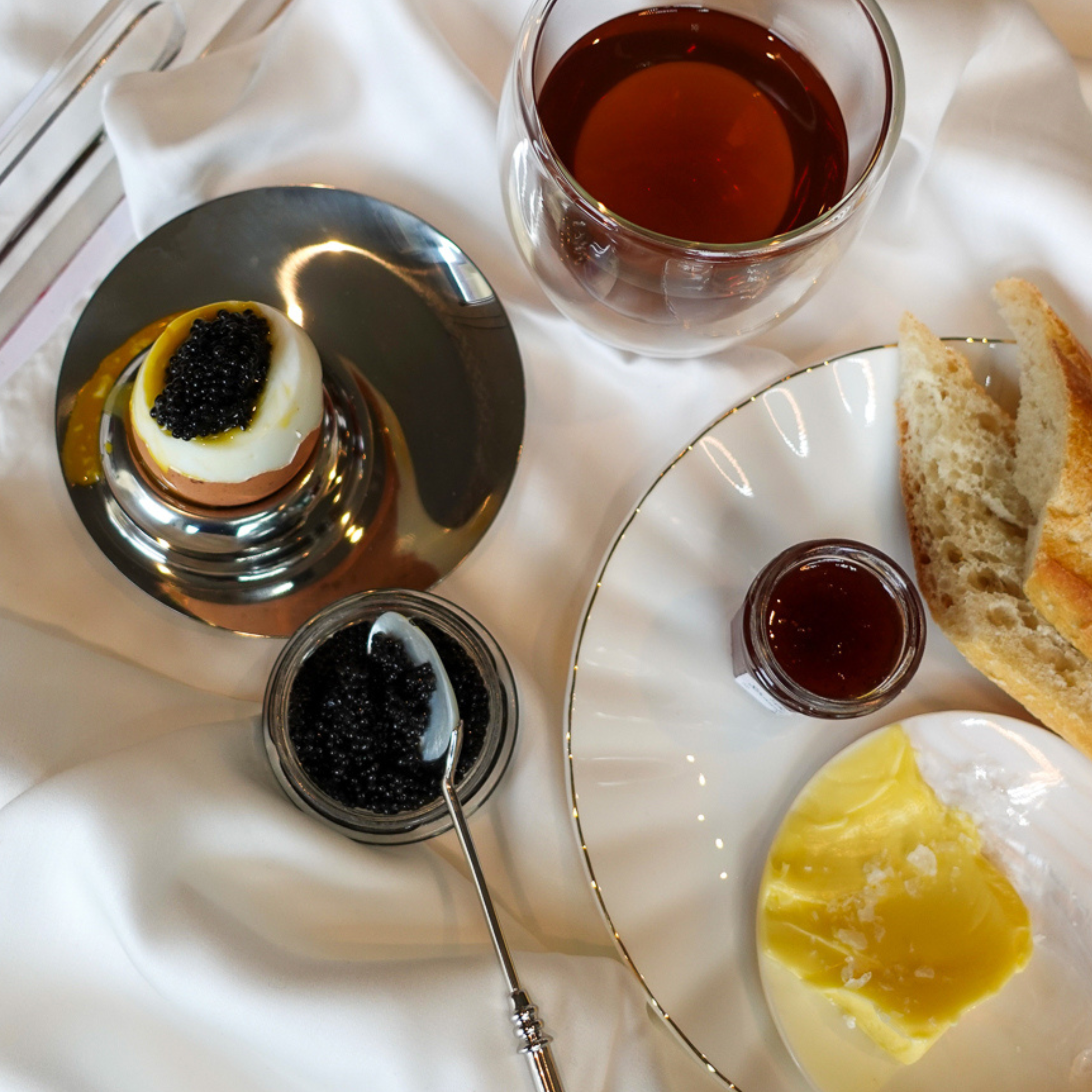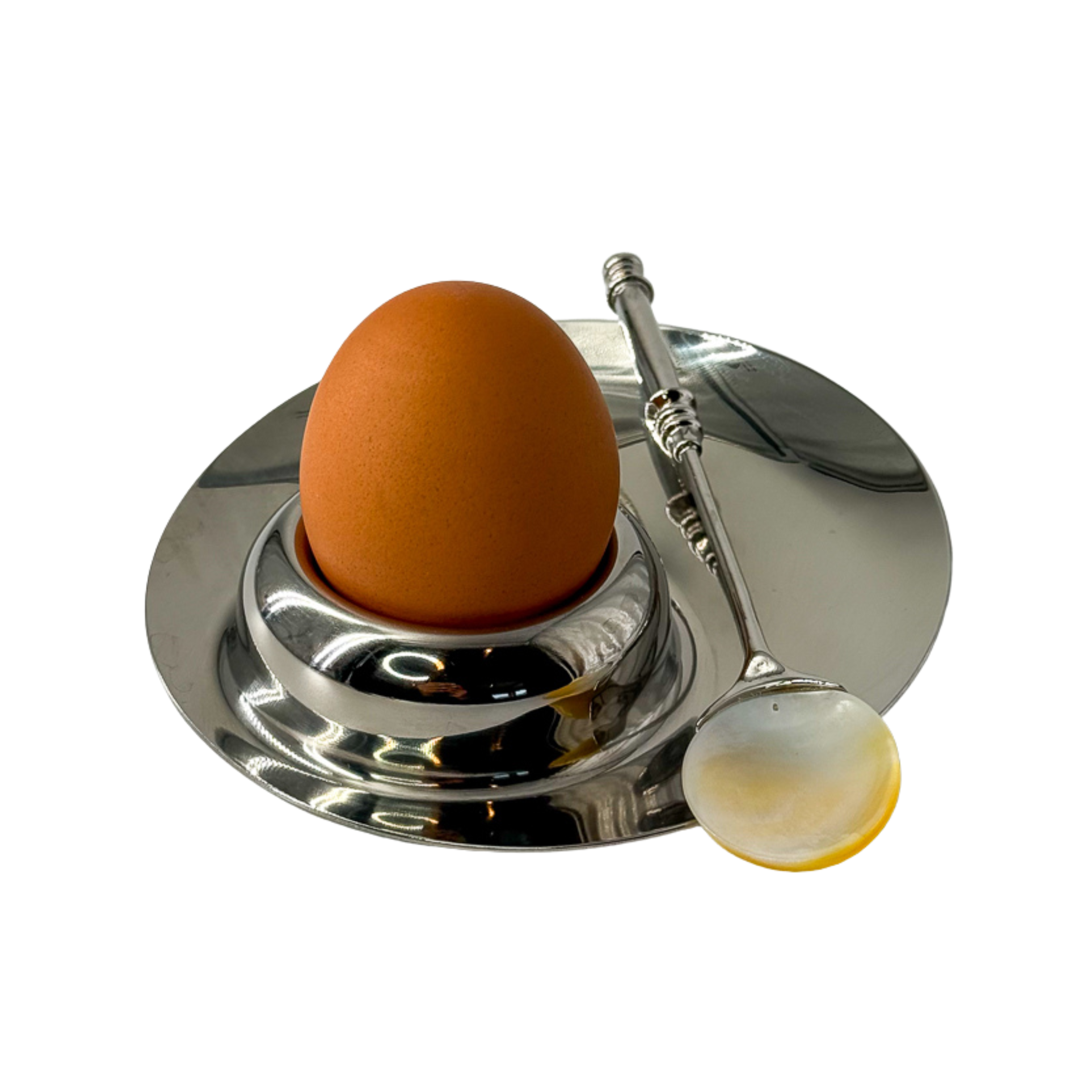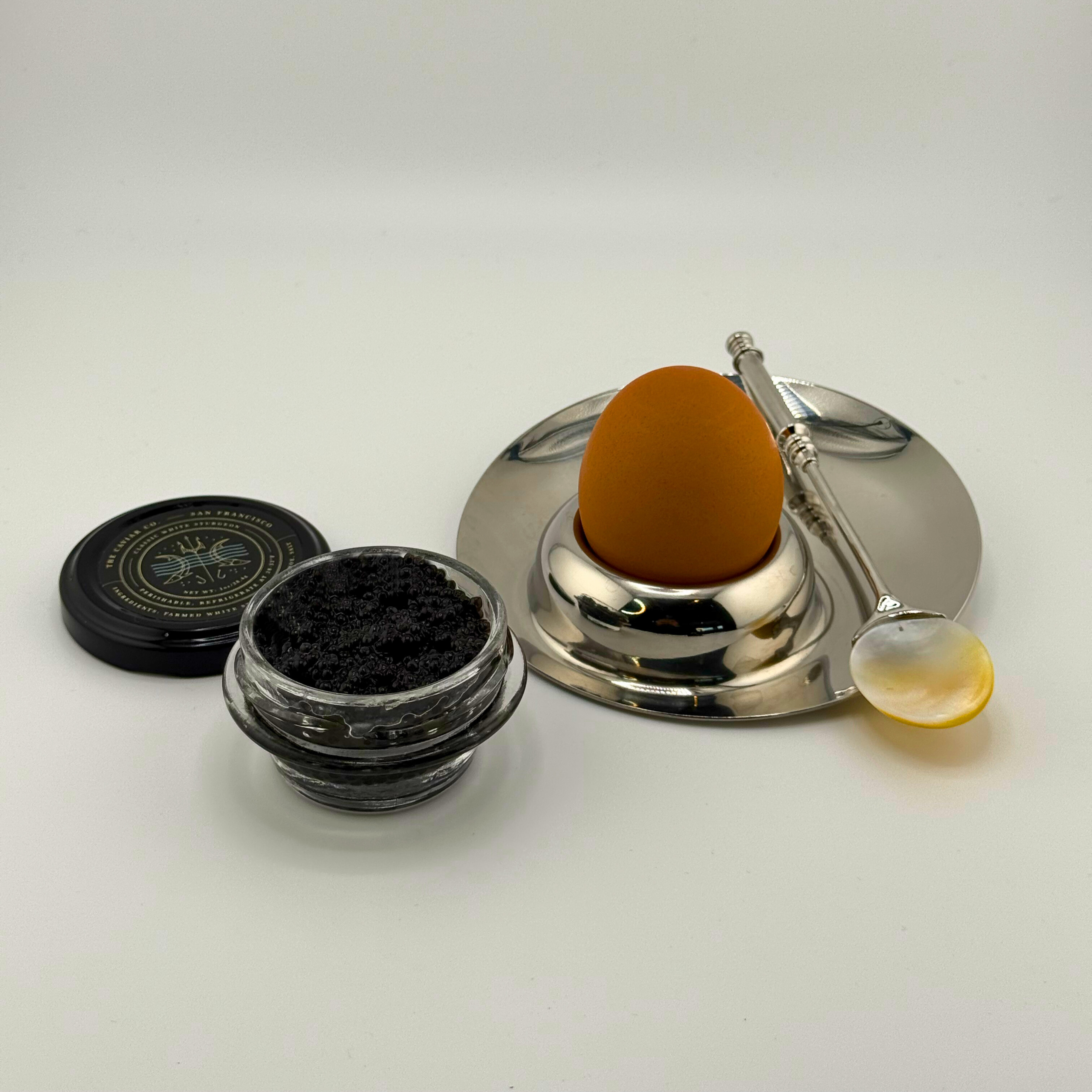 Sleek and sculptural, the Egg Éclat egg cup is crafted from polished stainless steel and subtly engraved with Moda Operandi x The Caviar Co. Paired with a metal-handled Mother-of-Pearl spoon, it reimagines the ritual of enjoying a soft-boiled egg topped with caviar.