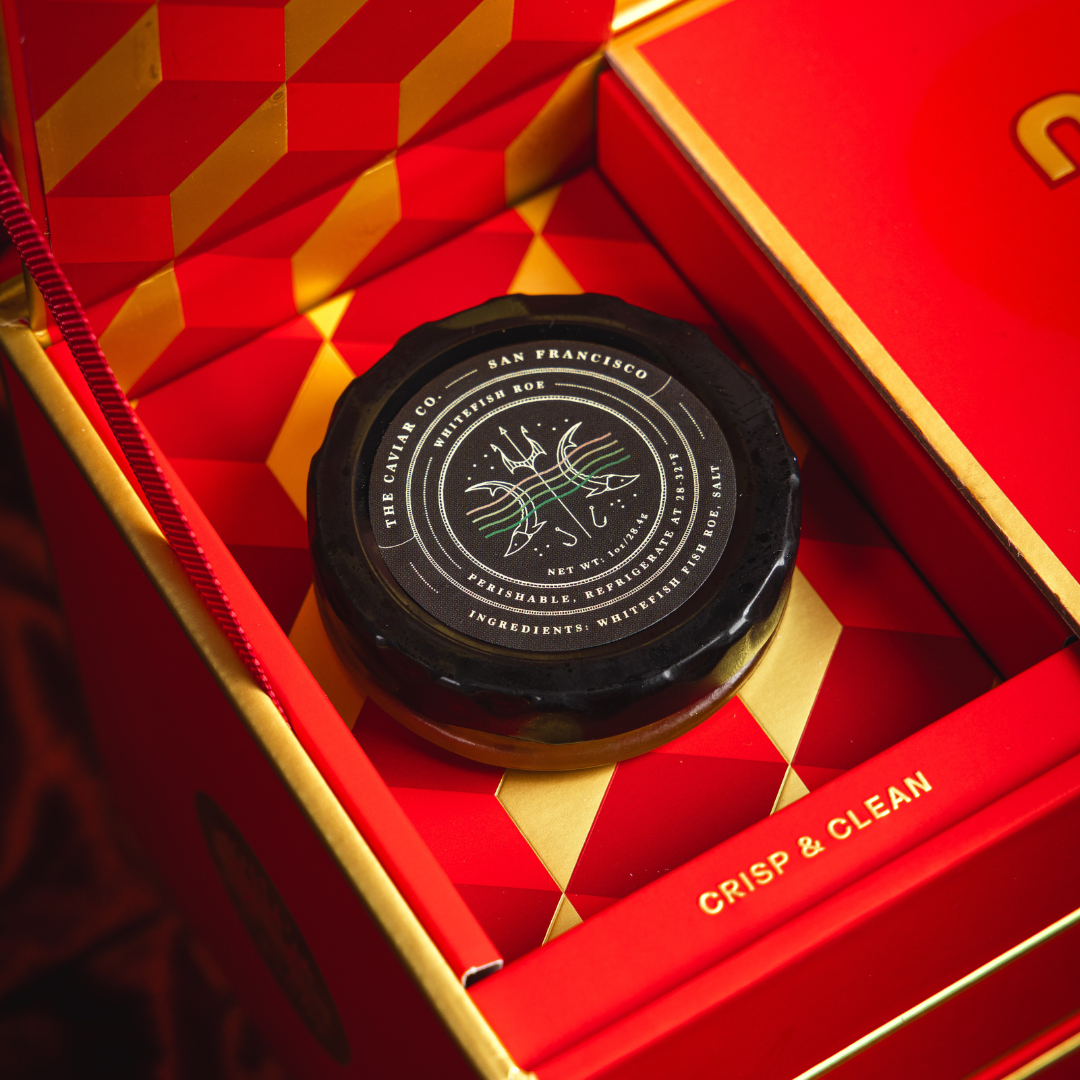 Inside are 12 mini drawers filled with 1oz tins of caviar and roe (perfect for two to share), mother-of-pearl spoons, a gold tin key, and custom recipe cards catered to each caviar/roe variety. Best of all? The chic, festive packaging is designed to fit right into your home refrigerator just like a bottle of wine.